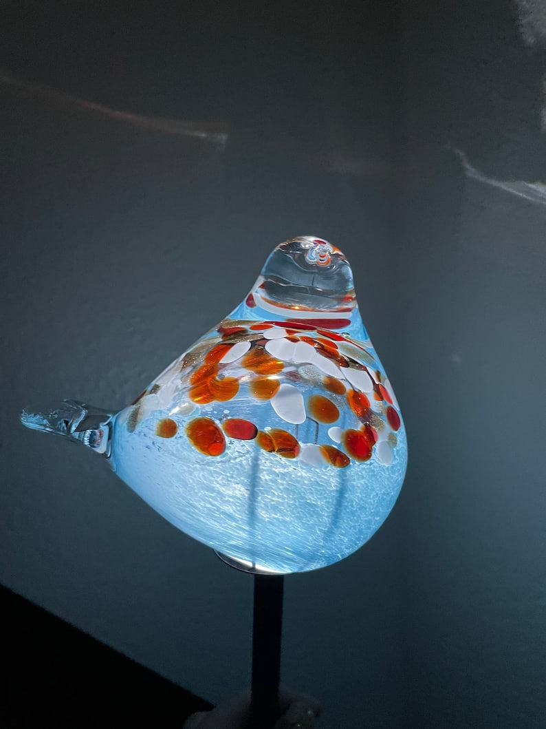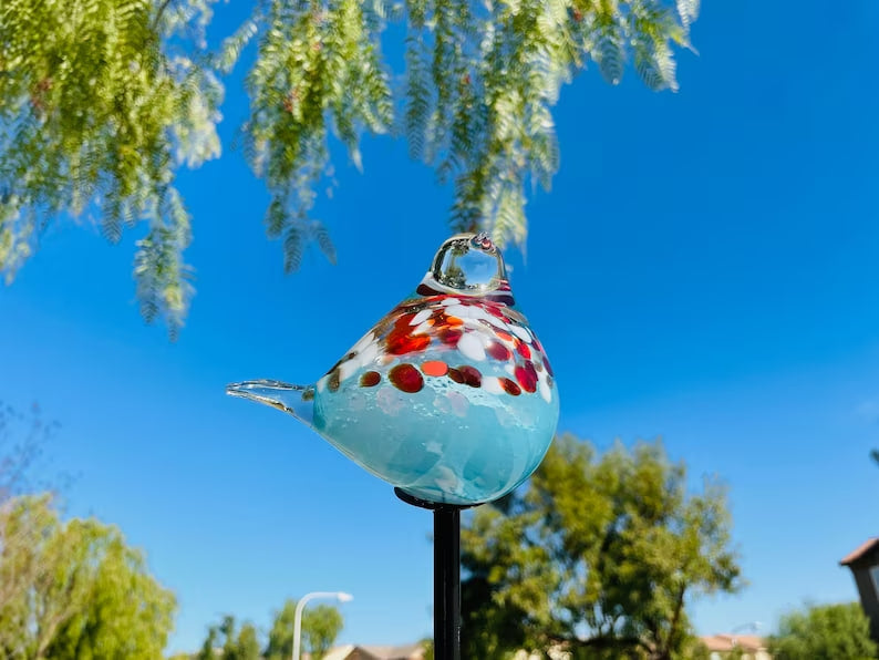 Hand blown glass bird is rich in color that will never fade under the sun and truly remarkable when it catches the light.