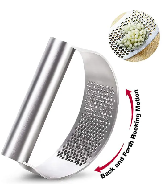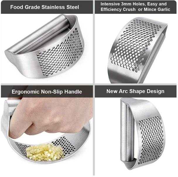 The ergonomic design of this garlic press sets it apart. Featuring a unique grip design, it is not only convenient to hold but also effortless to press garlic. The arc shape and comfortable handle design make it exceptionally easy to squeeze garlic and ginger, catering to individuals with weaker grips or smaller hands. This makes it the perfect kitchenware and a distinctive home tool for your family's needs.